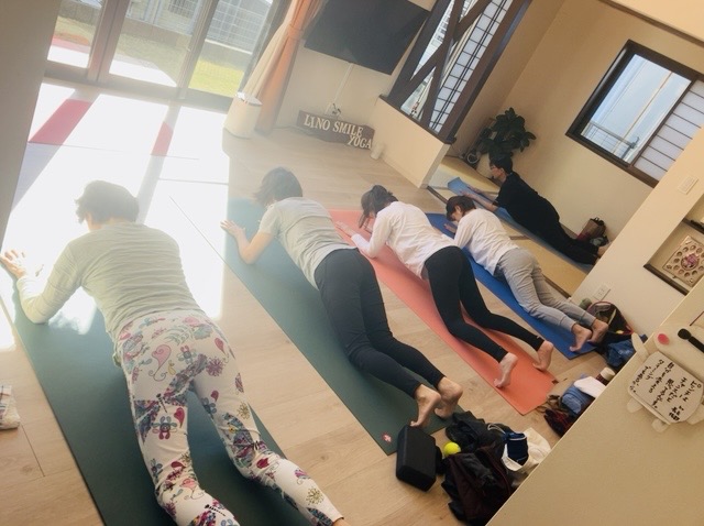 今月は、もも前・もも裏・お尻をきたえるポーズを取り入れています