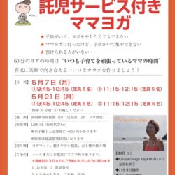 こんにちは。 リノ・スマイルヨガのユミです 体を動かすには、 とても気持ちのいい季節になりましたね! じんわり汗をかくのもいい気分です💦 今日は、毎回大好評の 【託児サービス付きママヨ…