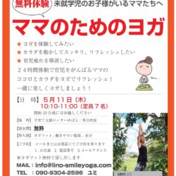 こんにちは。 リノ・スマイルヨガのユミです 今日は、【託児サービス付きママヨガ】の日 小雨が降る中、 9人のママと12人のお子様にお越し頂きました 5月のテーマ【気分爽快】 環境の変化による 精神的な緊張が続いた4月も終わり、 5月からは心に溜まったストレスも体の疲れも ス…